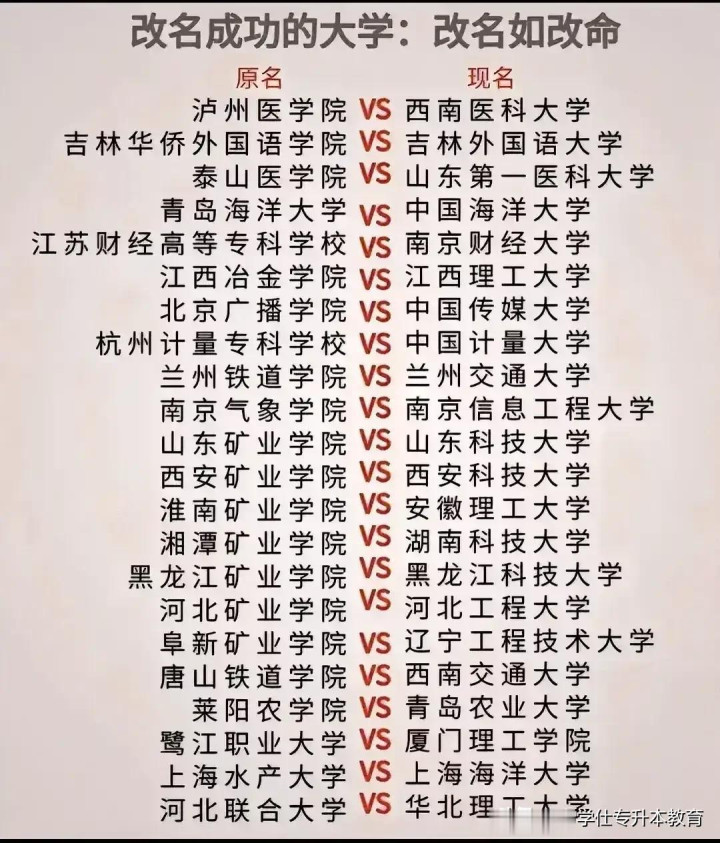 因为改名能够更好的助推学校发展,例如下面这些院校,大部分现在发展已经非常迅猛。